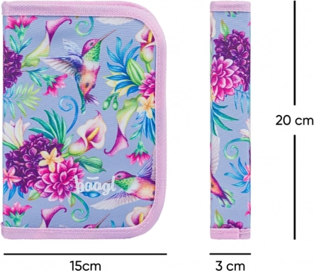 Jednopoziomowy piórnik z dwiema klapkami (bez wyposażenia) oraz wytrzymały worek z dolną kieszonką na zamek i karabińczykiem do przypięcia do plecaka – wszystko w motywie Koliberek.