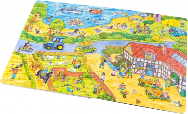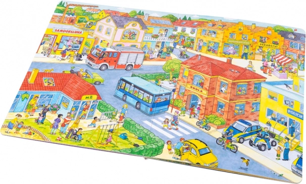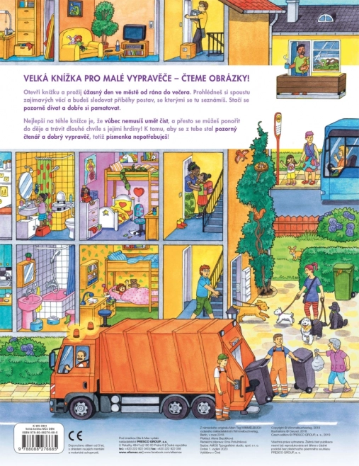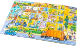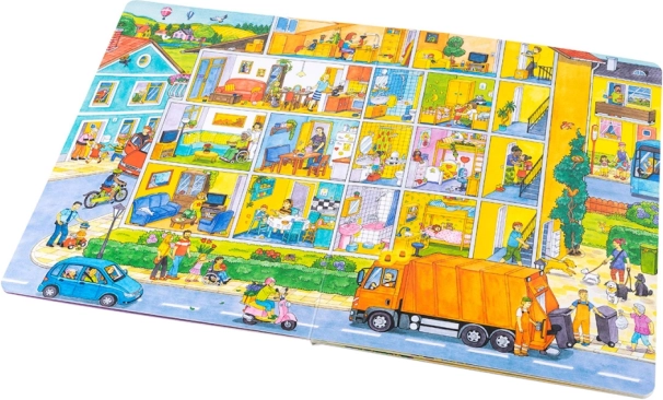 Ta wielkoformatowa książka idealnie nadaje się do wspólnego czytania i opowiadania. Dzieci poznają, co dzieje się w mieście od rana do wieczora – od pracy śmieciarzy i zakupów, przez przedszkole, budowę, straż pożarną i policję, aż po popołudniową zabawę w parku oraz wycieczki nad jezioro lub na farmę. Każda strona jest pełna bodźców do rozmowy i wyszukiwania szczegółów.
