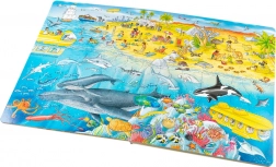 Barwne podwodne i nadbrzeżne sceny prezentują wieloryby, delfiny oraz rafy koralowe i poszerzają horyzonty małych czytelników.