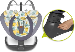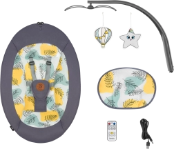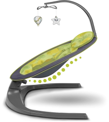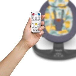 Intuicyjne sterowanie przez panel dotykowy lub dołączony pilot pozwala ustawić 5 prędkości kołysania, wybrać timer (8/15/30 min) czy włączyć 12 kojących melodii. Automatyczne wykrywanie ruchu uruchamia kołysanie, gdy wykryje poruszenie dziecka. Odpinany pałąk z zabawkami z 2 zabawkami wspiera rozwój zmysłów i zajmuje maluszka.