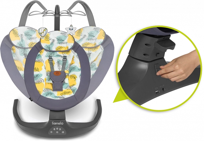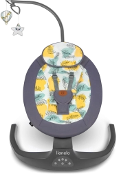 Praktyczny leżaczek i huśtawka 2w1 LIONELO Ralf oferuje delikatne kołysanie z prawej na lewą, 2 pozycje nachylenia oparcia, automatyczne wykrywanie ruchu oraz cichą pracę silnika. Dzięki 5 prędkościom kołysania, timerowi 8/15/30 min i 12 melodiom łatwo ukoi maluszka. Bezpieczeństwo zapewniają 5‑punktowe pasy, a komfort miękka poduszka i łatwo zdejmowany do prania pokrowiec. Zasilanie możliwe bateriami i przez USB.