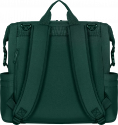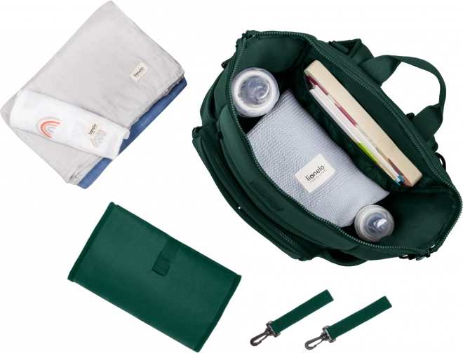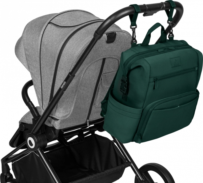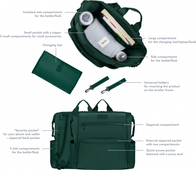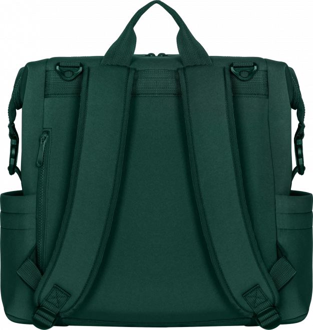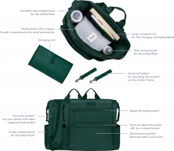 Plecak można nosić na plecach, przypiąć do wózka za pomocą odpinanych uniwersalnych pasków lub używać jako samodzielnego dodatku. Kieszeń do przewijania posłuży także jako przegroda na tablet lub laptop, natomiast boczne i wewnętrzne kieszenie utrzymają wszystko pod ręką. Dzięki paskom można zmniejszyć rozmiar tak, aby plecak zmieścił się pod siedzeniem w samolocie.