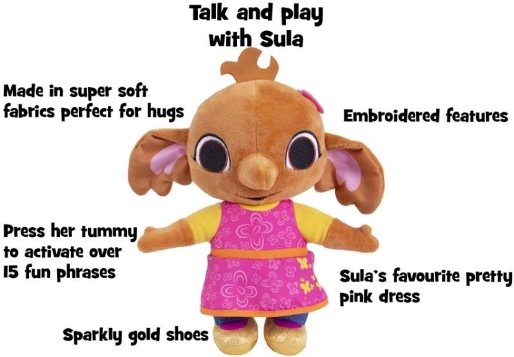 Mówiąca po angielsku słonica Sula z zabawnymi kwestiami! Urocza pluszowa zabawka idealna do przytulania. Sula, tak jak Bing, kocha przygody – czy to wycieczka do parku, czy dzień w przedszkolu, króliczek jest doskonałym towarzyszem. Naciśnij brzuszek Suli i posłuchaj jej brytyjskiego akcentu. Sula jest wykonana z miękkiej tkaniny i ma piękne, haftowane detale. Przybliżony rozmiar słonicy to 30 cm. Produkt zawiera niewymienne baterie. Średnia żywotność baterii przy codziennym użytkowaniu to ok. 6 miesięcy. Odpowiednie dla dzieci od urodzenia.
