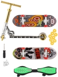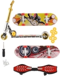 - 2× mini deskorolka, 1× finger hulajnoga, 1× waveboard, kółka, śrubki, mini śrubokręt