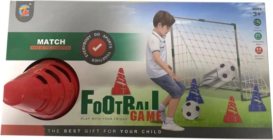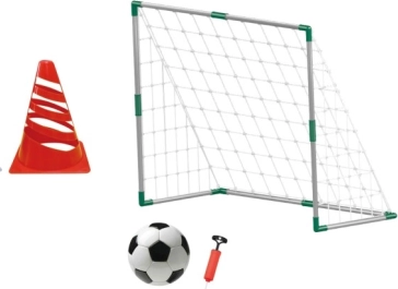 Zestaw zawiera bramkę z siatką, piłkę nożną, pompkę i pachołek treningowy – dzieci mogą zacząć grać od razu po rozpakowaniu.