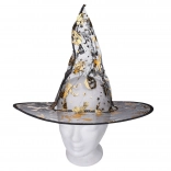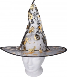 Elegancki kostium karnawałowy czarownicy w złotym kolorze zawiera sukienkę i kapelusz i jest idealny na karnawał, bal maskowy oraz Halloween. Dostępny w rozmiarach S, M, L.
