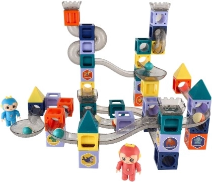 Różnorodne klocki, rampy i akcesoria pozwalają układać wciąż nowe tory kulkowe. Dzieci w zabawny sposób poznają zasady grawitacji i prędkości.