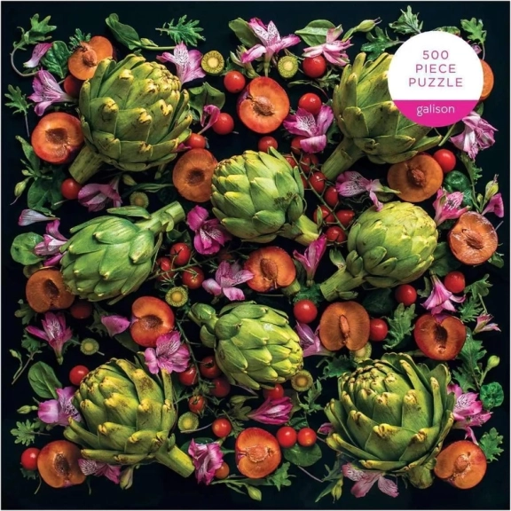 Odkryj urok doskonale niedoskonałych plonów z puzzlami GALISON Karczochowe kwiaty 500 elementów. Motyw autorstwa fotografki Sarah Phillips oferuje kontrastową kompozycję z karczochami, pomidorami i kwiatami na czarnym tle. Dzięki wysokiej jakości drukowi, matowemu wykończeniu i precyzyjnie wyciętym elementom czeka Cię płynne układanie oraz wierne odwzorowanie detali i kolorów. Puzzle wykonano z materiałów z recyklingu i zrównoważonych, a zapakowano w solidne pudełko prezentowe z dołączonym arkuszem podglądowym.