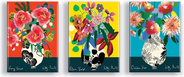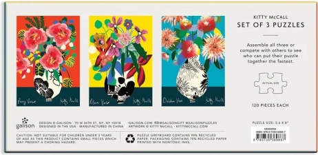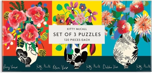 Zestaw puzzli Kitty McCall zawiera trzy układanki po 120 elementów z wyrazistymi, kolorowymi ilustracjami kwiatowych aranżacji w wazonach autorstwa artystki Kitty McCall, pochodzącej z Nigerii brytyjskiej twórczyni. Kitty McCall, inspirowana światem natury wokół siebie oraz pulsującymi pejzażami wczesnego dzieciństwa w Nigerii, wypracowała charakterystyczny styl odważnych barw, nakładających się wzorów i kształtów, tworząc geometryczne motywy i kwiatowe krajobrazy do wnętrz i akcesoriów. Zewnętrzne pudełko ma magnetyczne zamknięcie. Puzzle są zapakowane w solidne pudełko, odpowiednie do ponownego użycia i przechowywania. Idealne na prezent. Autorką ilustracji jest Kitty McCall. Puzzle wykonano z wykorzystaniem znaczącego udziału papieru z recyklingu i charakteryzują się najwyższej jakości nadrukiem przy użyciu bezpiecznych farb. Pokryto je matową powłoką, która zapewnia wierne odwzorowanie detali i kolorów w każdych warunkach. Rewers elementów ma gładkie, przyjemne w dotyku wykończenie, dzięki czemu podczas przechowywania ułożonego obrazu nie tworzy się kurz. Wraz z starannie zapakowanymi elementami w zestawie znajduje się także ulotka z obrazkiem referencyjnym, która zazwyczaj zawiera dodatkowe informacje o twórcach i tle powstania dzieła. Dostarczane w wyjątkowo solidnym i atrakcyjnie wykonanym kartonowym pudełku wyprodukowanym z recyklingu.
