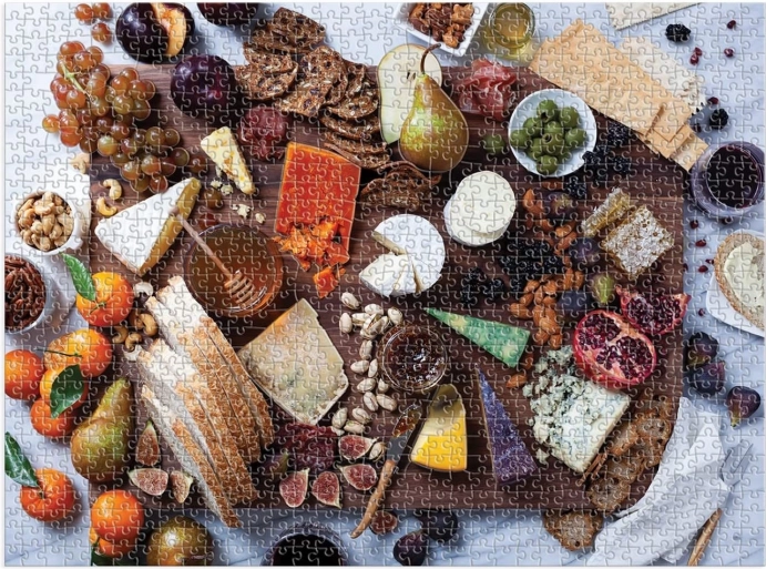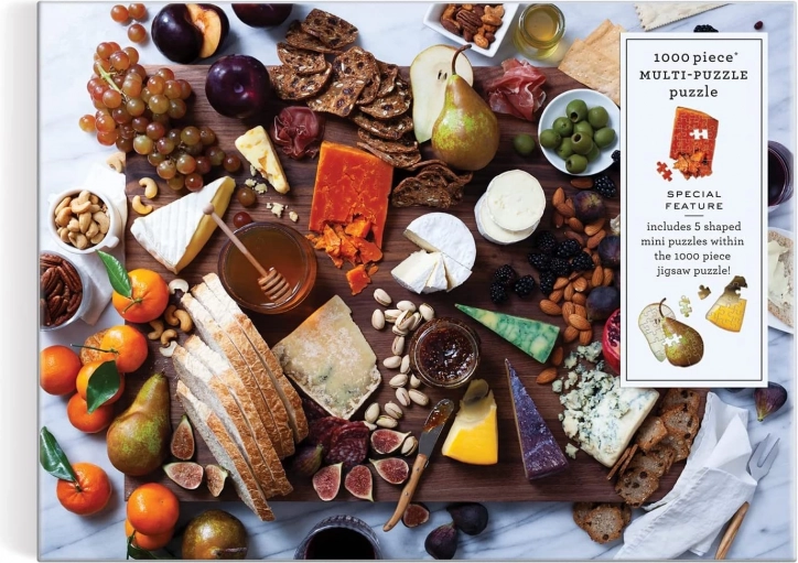 Puzzle premium 1000 elementów z motywem serowej deski, matowe wykończenie, 5 mini puzzli, materiały z certyfikatem FSC. Piękny prezent i relaks dla miłośników designu i gastronomii.