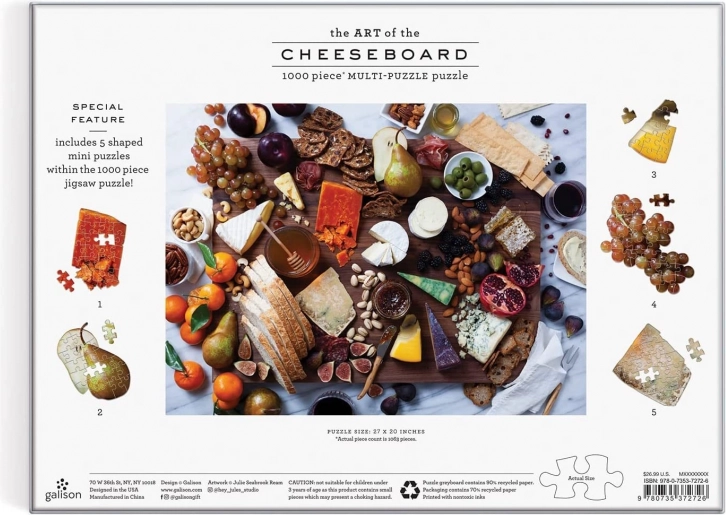 Delektuj się kulinarnym doświadczeniem z premium puzzle z motywem serowej deski degustacyjnej autorstwa Julie Seabrook Ream. Zestaw oferuje 1000 precyzyjnie wyciętych elementów, matowe wykończenie dla wiernych kolorów i detali, 5 mini puzzli jako zabawny bonus oraz ekologiczną produkcję z przetworzonego papieru z nadrukiem nietoksycznymi farbami. Idealny prezent i doskonały relaks dla dorosłych i starszych dzieci.