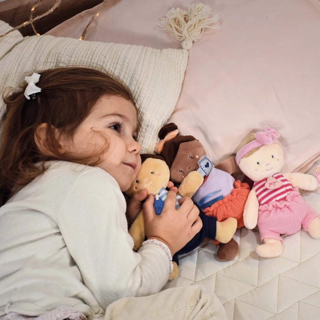 Ta mięciutka lalka w pomarańczowym kolorze to idealna pierwsza zabawka dla niemowląt. Jest lekka, dobrze leży w rączkach, a dzięki miękkiemu wykonaniu dzieciom łatwo się nią manipuluje. Lalka trzyma w ręce małą buteleczkę i wspiera rozwój małej motoryki oraz wyobraźni.