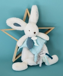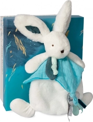 Ten zestaw prezentowy marki Doudou zawiera mięciutkiego pluszowego króliczka z przytulanką, który ucieszy zarówno niemowlę, jak i rodziców. Stylowe wykonanie z delikatnymi wstążkami oraz nowoczesnym niebieskim kolorem sprawia, że to piękna ozdoba pokoju dziecięcego i ulubiona zabawka do przytulania.