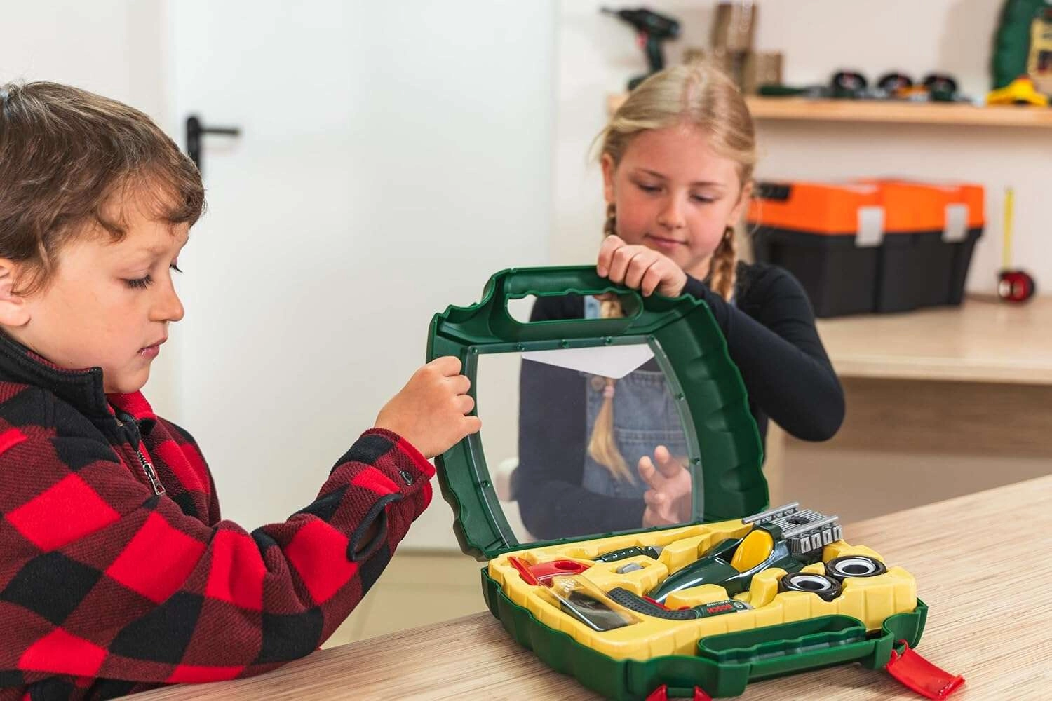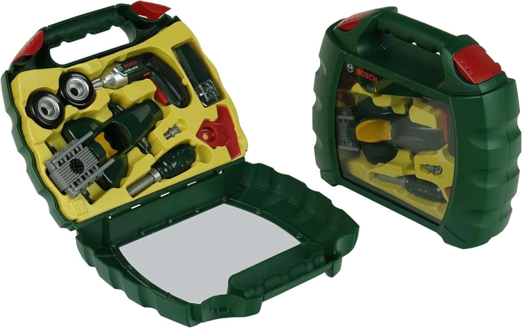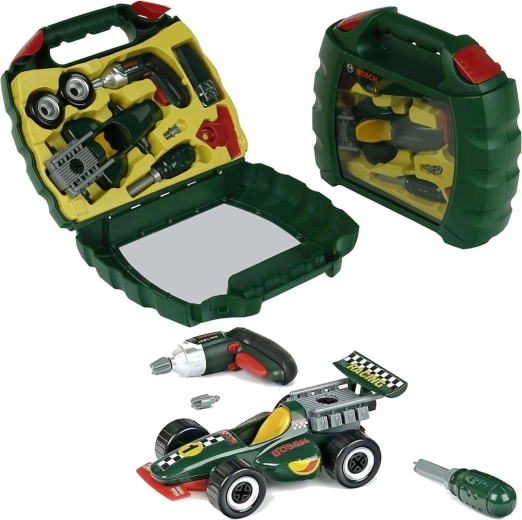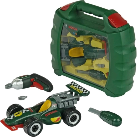 Ten realistyczny zestaw na licencji BOSCH mini zawiera dziecięcą akumulatorową wkrętarkę Ixolino z obrotowym bitem i efektem dźwiękowym, śrubokręt, śruby oraz wszystkie elementy potrzebne do zbudowania ciemnozielonego samochodu wyścigowego. Wszystko jest przejrzyście ułożone w solidnej plastikowej walizce z przezroczystą pokrywą i wygodnym uchwytem, więc zabawkę łatwo zabrać wszędzie ze sobą.