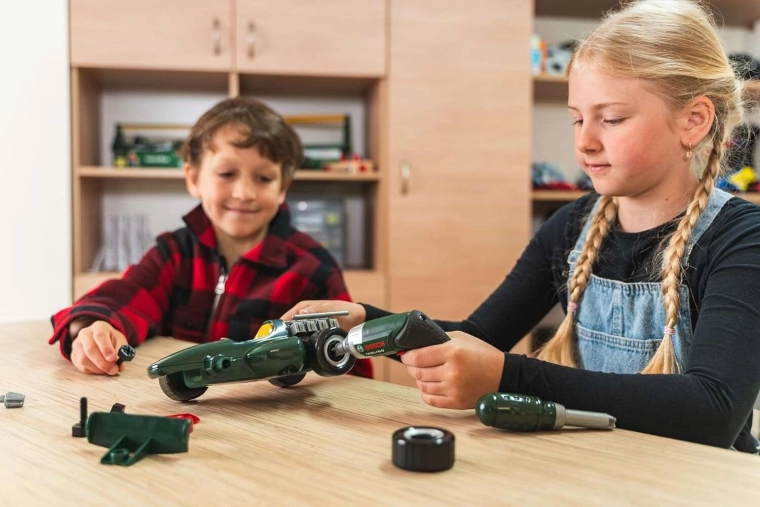 - Realistyczne narzędzia: dziecięcy BOSCH Ixolino z dźwiękiem i obrotem dla autentycznych wrażeń