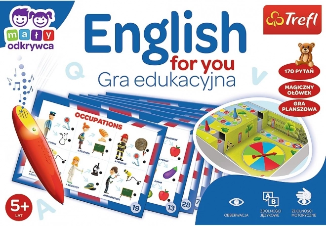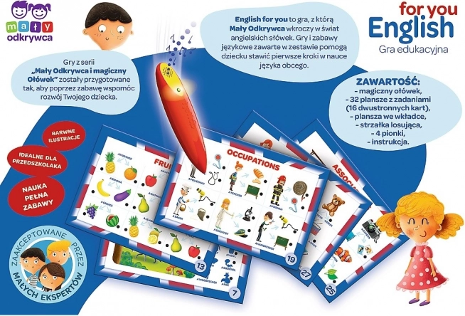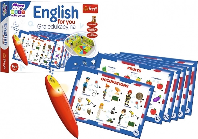 English for You to sprytnie zaprojektowane połączenie gry planszowej i quizu, które prowadzi dzieci przez codzienne sytuacje i słownictwo w języku angielskim – od zawodów, przez owoce, aż po pomieszczenia w domu. Z magicznym długopisem nauka staje się przyjemnym wyzwaniem, a dzieci od razu widzą, kiedy odpowiedziały poprawnie.