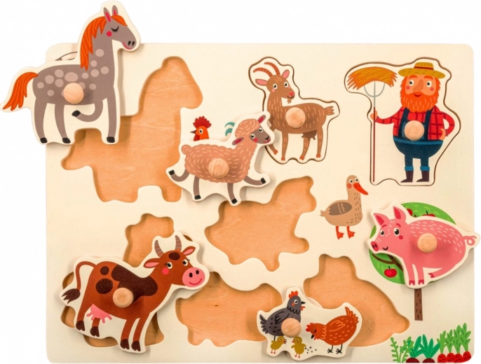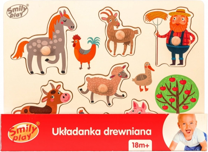 Ta wysokiej jakości drewniana układanka zawiera tablicę oraz sześć oddzielnych elementów z motywami zwierząt z farmy. Każdy element ma ergonomiczny uchwyt, aby ułatwić dzieciom manipulowanie, i pasuje do swojego wyprofilowanego miejsca. Zabawa w atrakcyjny sposób rozwija koordynację ręka–oko, motorykę małą oraz pamięć wzrokową.