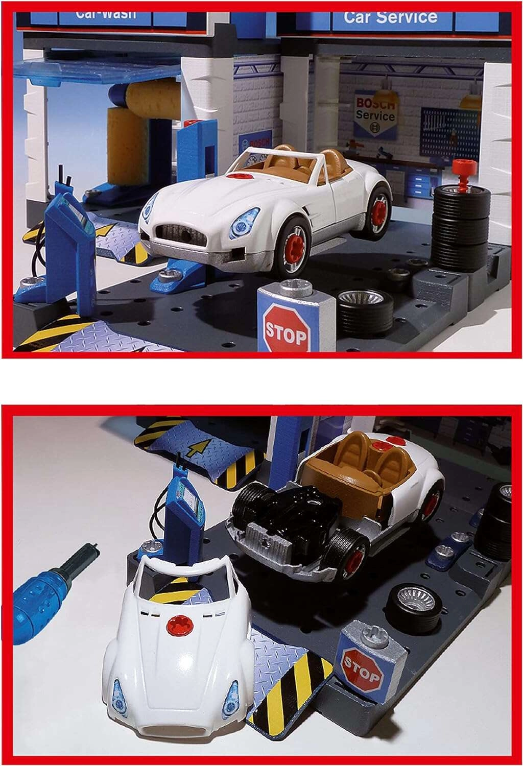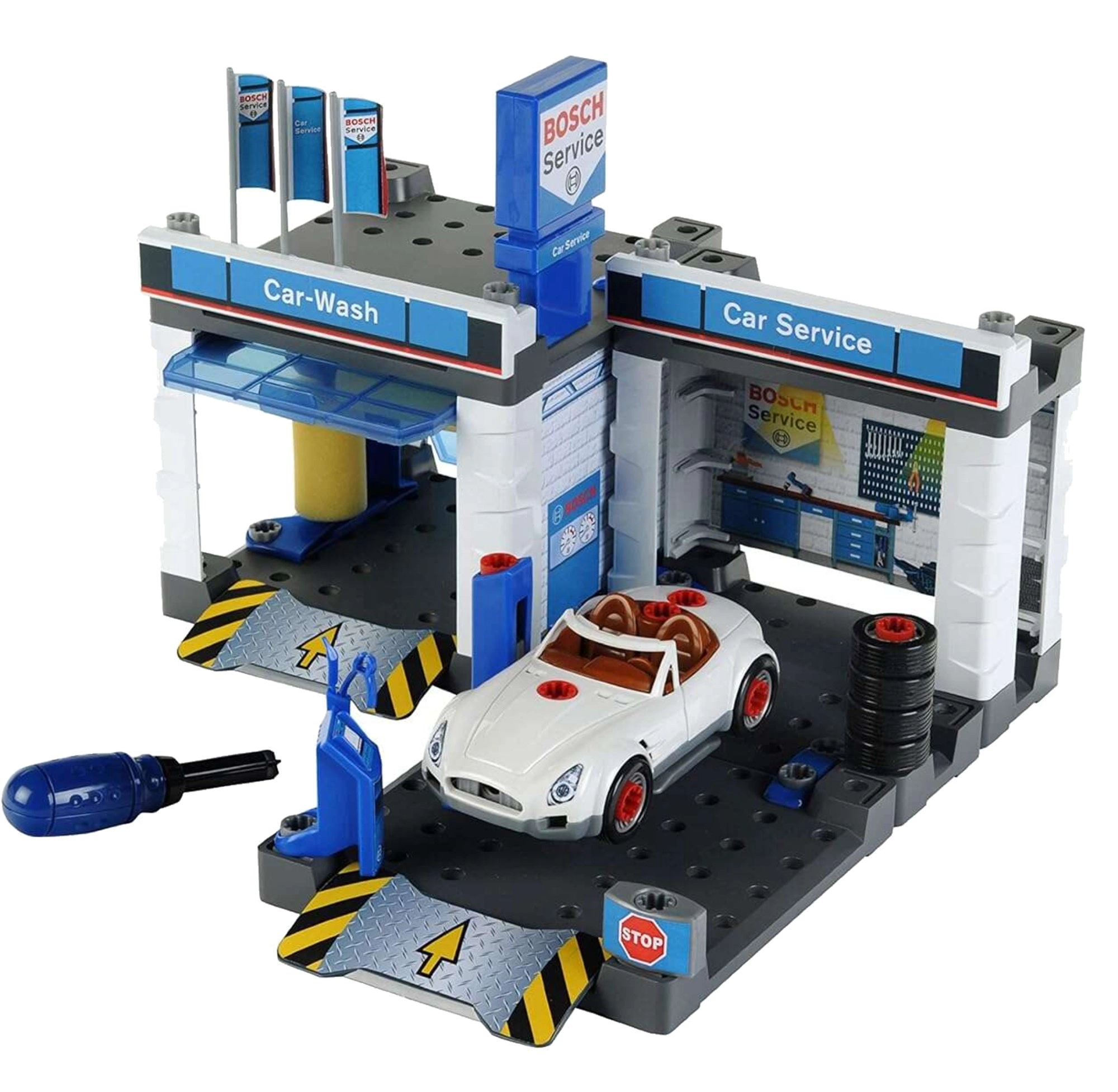 Ta stacja serwisowa w stylu BOSCH Service łączy myjnię, strefę serwisową i montażowy warsztat w jednym. W zestawie znajduje się biały kabriolet, który dzieci mogą rozkręcać i składać za pomocą dołączonego śrubokręta. Ruchome wałki myjni, podnośnik oraz stanowisko serwisowe z „komputerem” zapewniają realistyczne wrażenia z zabawy.