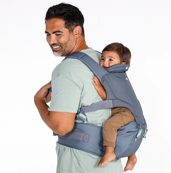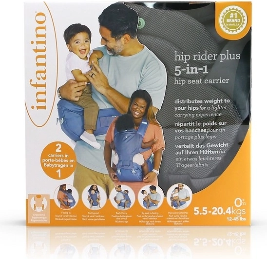 Uniwersalne nosidełko dla dzieci z biodrowym siedziskiem 5 w 1 od INFANTINO zapewnia wygodne i ergonomiczne noszenie od noworodka po malucha. Dzięki regulowanym, wyściełanym szelkom, szerokiemu pasowi biodrowemu i zintegrowanemu hip siedzisku równomiernie rozkłada ciężar, odciążając plecy i ramiona. Oferuje wiele pozycji noszenia (z przodu, na plecach oraz z siedziskiem na biodrze twarzą do środka/na zewnątrz), ma praktyczną boczną kieszeń oraz opcjonalną podpórkę głowy dla wygody dziecka w podróży.