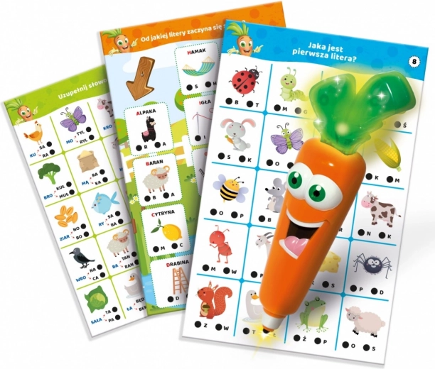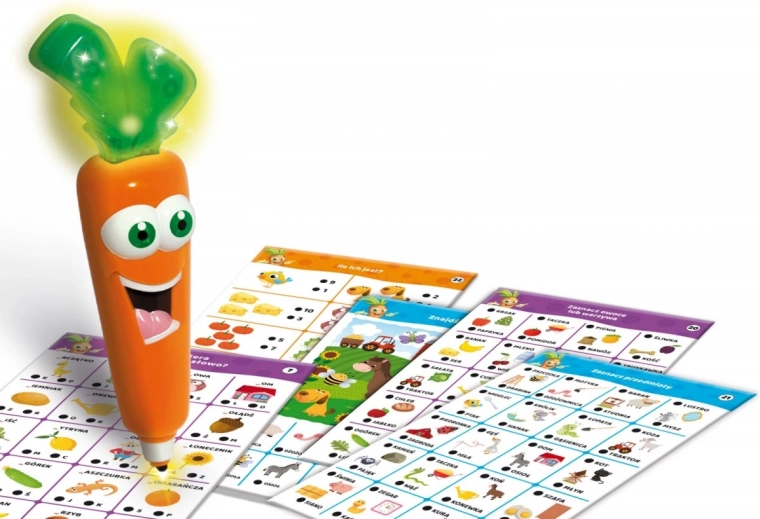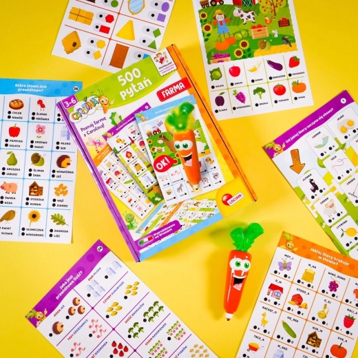 Gra Carotina 500 pytań pomoże Twojemu dziecku nauczyć się wielu słówek związanych z farmą dzięki 30 interaktywnym, edukacyjnym kartom. Wystarczy użyć mówiącej i świecącej Carotiny i odpowiedzieć na pytania, dotykając czarnych kropek przypisanych do odpowiedzi końcówką pióra. Twoje dziecko może też zagrać w grę Szukaj i znajdź, wyszukując zwierzątka na ilustracjach. Dobrej zabawy!