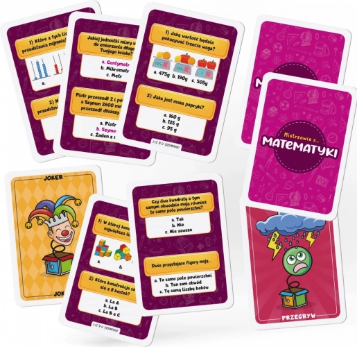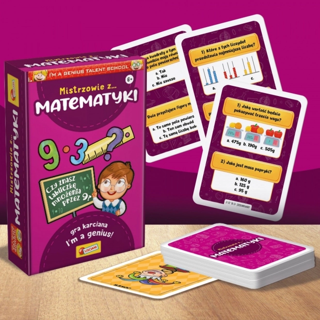 Matematyczni Mistrzowie to edukacyjna gra karciana dla 2–4 graczy. Jedna rozgrywka trwa około 20 minut. Wygrywa gracz, który jako pierwszy zdobędzie 5 kart, poprawnie odpowiadając na pytania.