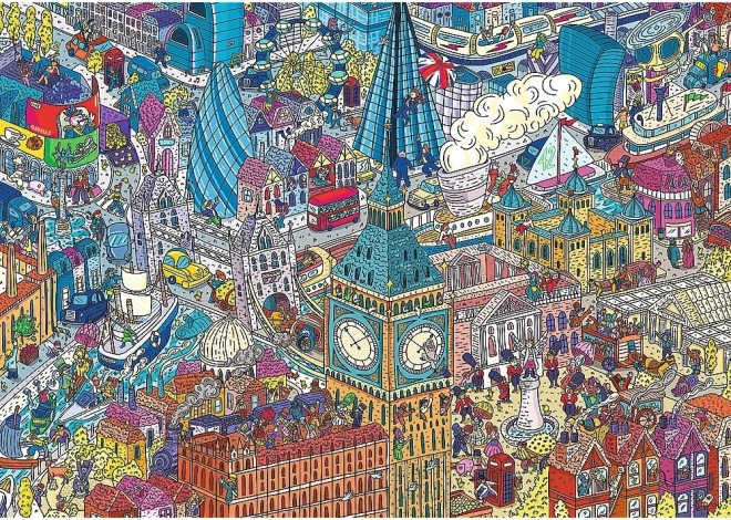 Trefl UFT puzzle Eye-Spy Time Travel: Londyn 1000 elementów. Nieograniczone łączenie motywów, wysokiej jakości niebieski karton, unikalne kształty, eko opakowanie. Wymiary 68,3×48 cm.