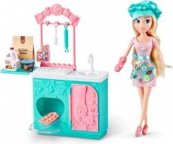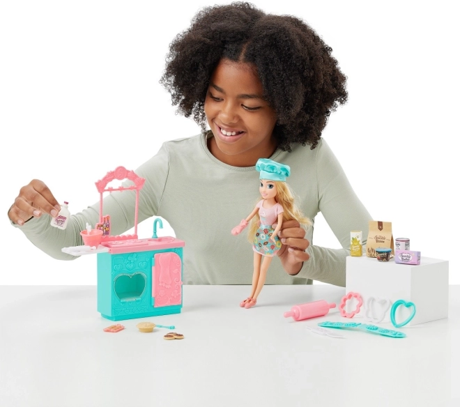Zawiera wszystko, co niezbędne do kompleksowej zabawy w pieczenie, w tym lalkę, zabawkowe jedzenie i akcesoria kuchenne.