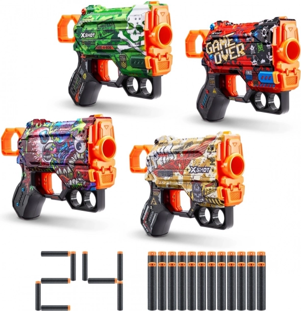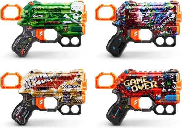 X-SHOT Skins przenosi świat personalizacji z gier do rzeczywistości. Ten korzystny zestaw Menace 4 Pack oferuje cztery kompaktowe blastery w unikalnych wzorach, z którymi zabłyśniesz w każdej bitwie. Dzięki lekkiej konstrukcji, pewnemu chwytowi i szybkiemu przeładowaniu są idealne do rąk dzieci oraz do zabawnych potyczek z przyjaciółmi.