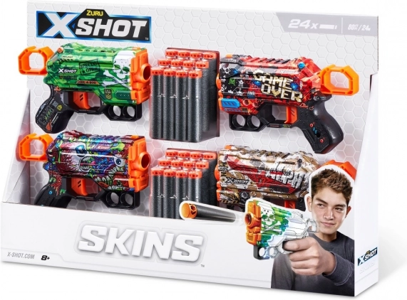 Podkreśl swój styl na polu bitwy dzięki technologii druku X-SHOT SKINS. W zestawie znajdziesz wzory Camo, Game Over, Scream oraz dodatkowo ekskluzywny skin Alpha Zone.