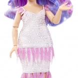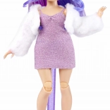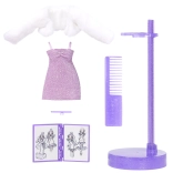 Lalka zachwyca gęstymi, falowanymi włosami idealnymi do czesania, błyszczącą sukienką, miękką białą „futerkową” kurteczką oraz fioletowymi bucikami na obcasie. W zestawie znajdziesz także grzebień, stojak i niewielki ilustrowany zeszyt z inspiracjami do tworzenia historii i projektów modowych.