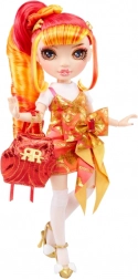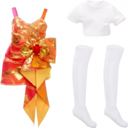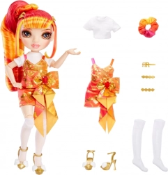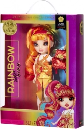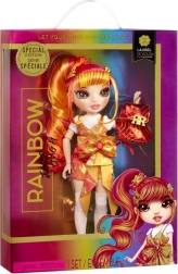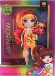 Laurel błyszczy w pomarańczowo‑złotej kompozycji z wyrazistymi detalami, które podkreślają modowy charakter serii RAINBOW HIGH.