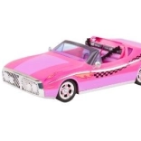Różowo‑fioletowe sportowe auto z szachownicowym pasem i płomieniami zachwyca od pierwszego spojrzenia i oferuje dużo miejsca dla dwóch lalek.