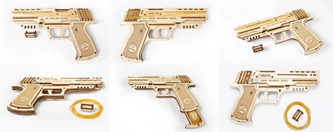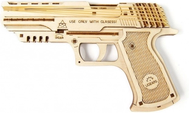 Model UGEARS Wolf-01 to szczegółowa drewniana replika pistoletu z napędem na gumki, którą złożysz bez kleju, wyłącznie przy użyciu precyzyjnie wyciętych elementów. Po złożeniu otrzymasz funkcjonalny model mechaniczny, który niezawodnie wystrzeliwuje gumki i pokazuje w praktyce współpracę kół zębatych, mechanizmu spustowego oraz sprężystości materiałów.
