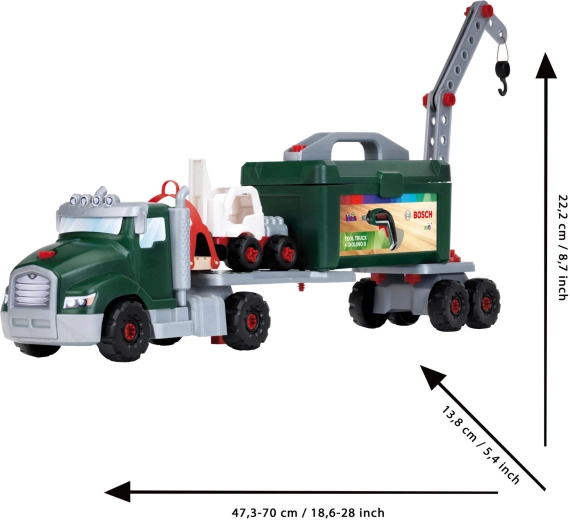 - Ciężarówka, zdejmowany box na narzędzia, przyczepa, dźwig, wózek widłowy z paletą, dziecięca wiertarka, śruby i elementy konstrukcyjne