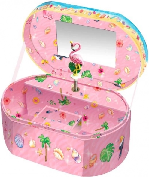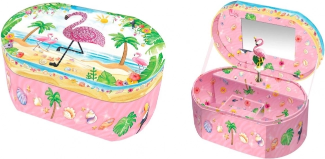 Stylowa owalna grająca szkatułka Flamingo jest idealna do przechowywania pierścionków, kolczyków czy małych sekretów. Po otwarciu uruchamia się piękna klasyczna melodia, a mała figurka zaczyna poruszać się w rytm muzyki. Dzięki wbudowanemu lusterku szkatułka jest praktyczna także podczas przymierzania biżuterii.