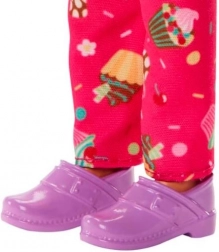Lalka Barbie ubrana jest w białą kucharską kurtkę z różowymi detalami i czapką kucharza, co pomaga jej w roli cukiernika.