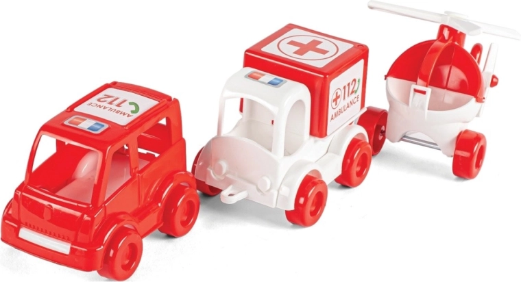 - 3‑częściowy zestaw szpitalny: ambulans, pojazd transportowy, śmigłowiec