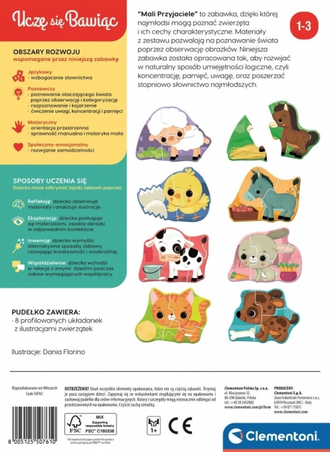 Ten zestaw puzzli „Mali przyjaciele – zwierzątka z farmy” marki CLEMENTONI wprowadza dzieci w świat układanek. Różne poziomy trudności (2, 3 i 4 elementy) pomagają dopasować zabawę do wieku i umiejętności dziecka, a barwne ilustracje zwierzątek z farmy pobudzają wyobraźnię i radość z odkrywania.