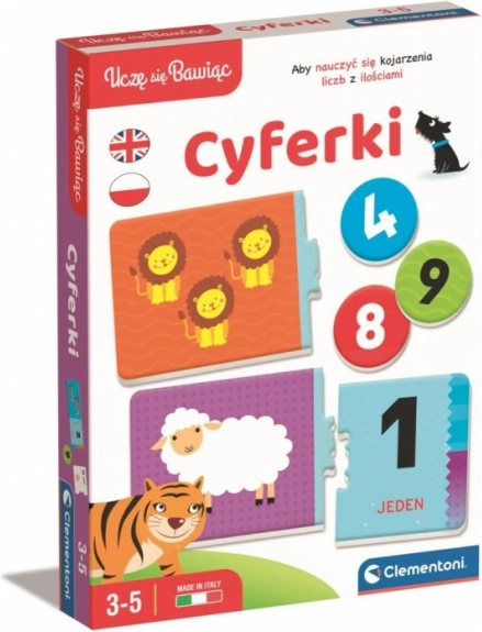„Cyfry” to prosta i zabawna gra edukacyjna składająca się z ilustrowanych, łączonych elementów z motywami przyjaznych zwierząt. Została opracowana dla dzieci w wieku od 3 do 5 lat, aby zapoznać je z podstawowymi pojęciami teorii zbiorów i innymi prostymi kategoriami matematycznymi. Wzajemnie dopasowane elementy umożliwiają samokontrolę, dzięki czemu dziecko może samo sprawdzać swoje odpowiedzi. Oferujemy podróż przez świat liczb, którą można odbyć samodzielnie, rozgrywać indywidualnie lub rzucić wyzwanie przyjaciołom i rodzinie w grupie. Zabawa, która nigdy się nie kończy!