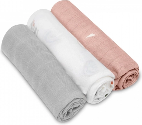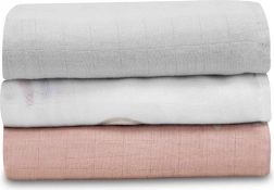 Trzy kolorystycznie dopasowane pieluszki o wymiarach 70 × 70 cm posłużą do owijania, podczas karmienia piersią, karmienia łyżeczką oraz jako podkład do przewijania – w domu i w podróży.