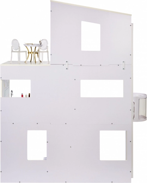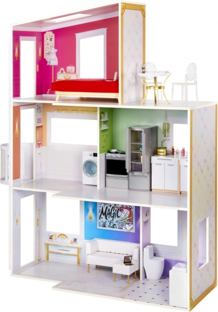 Domek Rainbow High Townhouse wnosi do dziecięcego pokoju styl i zabawę. Trzy kondygnacje z sypialnią, salonem, kuchnią i łazienką tworzą realistyczne środowisko do codziennych historii. Kompaktowe wymiary 89,87 × 26,04 × 50,5 cm świetnie pasują do większości pokoi dziecięcych, a solidna konstrukcja zapewnia długą żywotność zabawki.