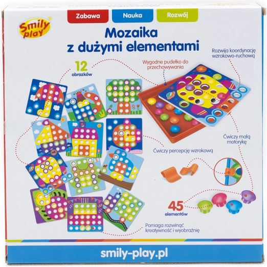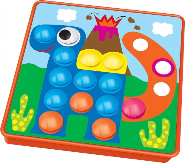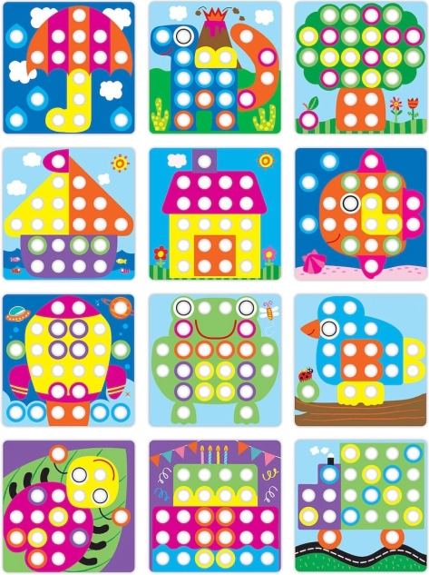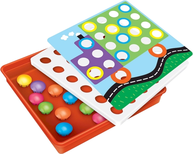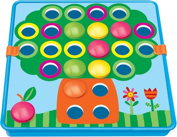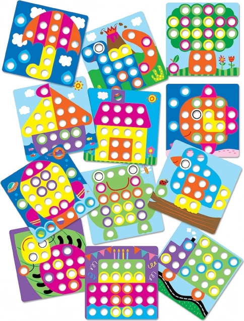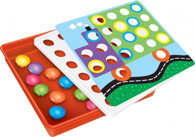 Rozpocznij zabawę, zdejmując przezroczystą folię i wyjmując kolorowe okrągłe elementy. Wybierz kartę, nałóż ją na folię i zacznij układać, umieszczając okrągłe klocki we właściwych miejscach.