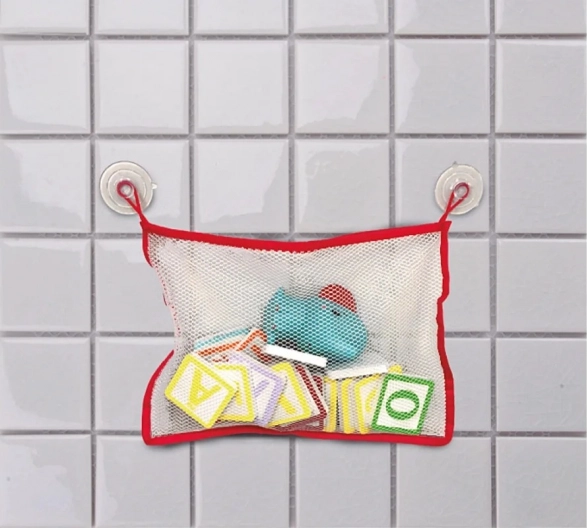 Siatkowy worek na zabawki z przyssawkami ułatwia organizację i suszenie zabawek w wannie.