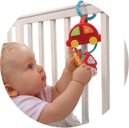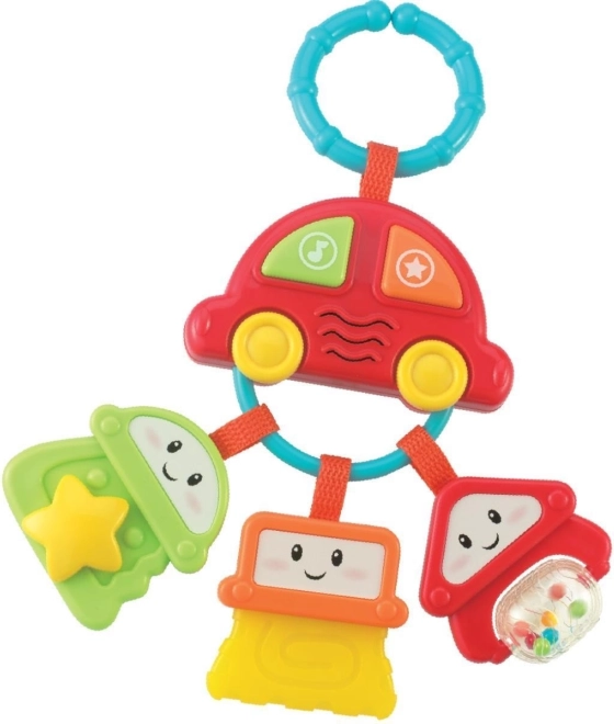 To zawieszane autko w formie breloczka z trzema kluczykami. Zawiera dwa kolorowe funkcjonalne przyciski, które uruchamiają różne dźwięki, efekty i zabawne melodie.