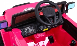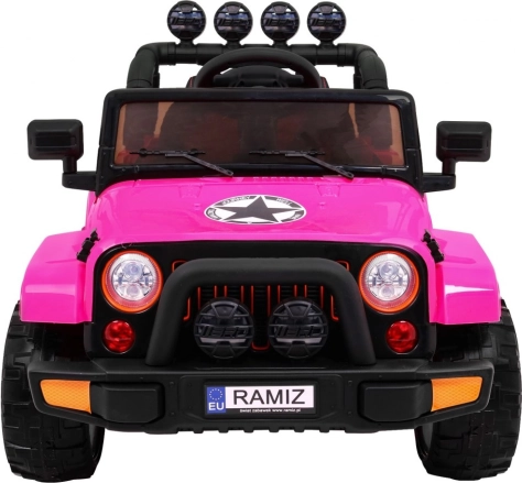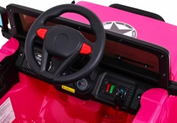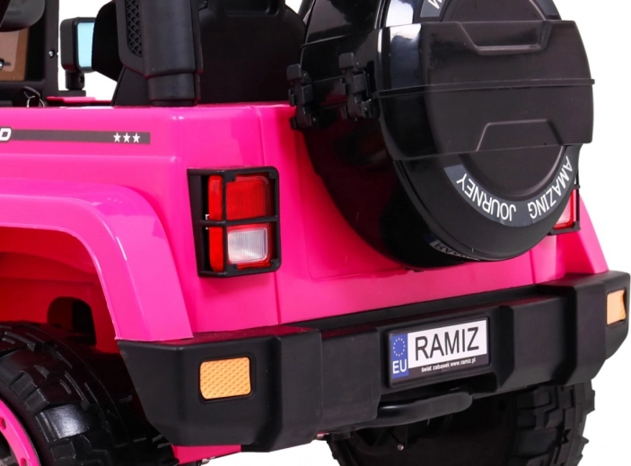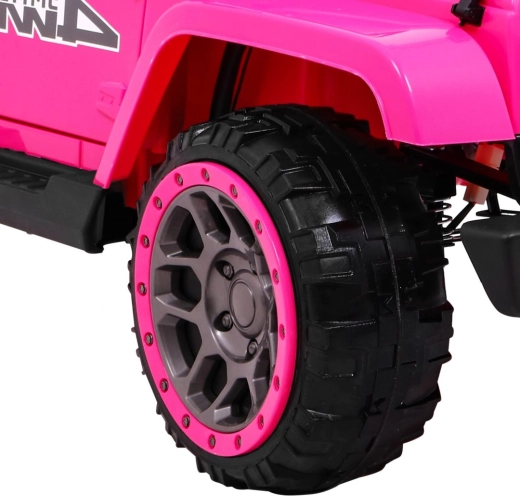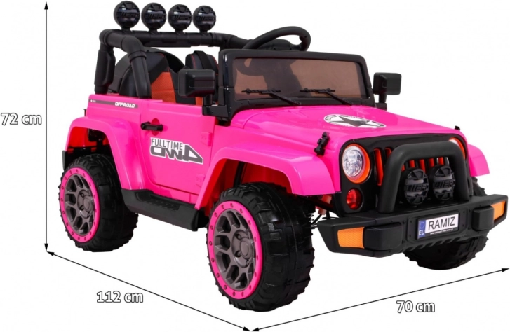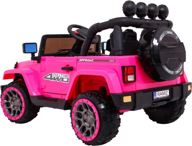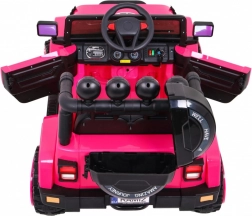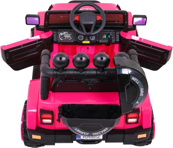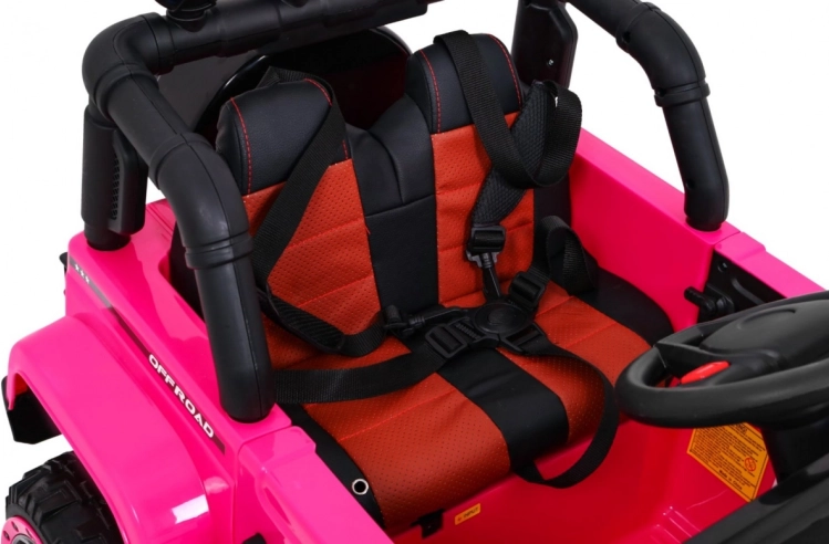 Rodzice docenią pilot 2.4 GHz z trzema prędkościami i przyciskiem bezpieczeństwa STOP. Wnętrze oferuje wygodne siedzisko z pięciopunktowymi pasami, otwierane drzwi z blokadą oraz funkcjonalny panel audio z MP3, USB, SD i wejściem AUX, a także wgrane melodie. Praktyczny schowek w tylnym kole zapasowym pomieści drobiazgi na drogę.