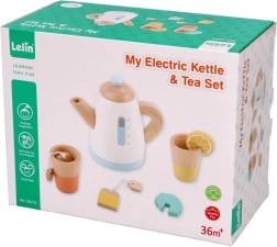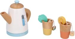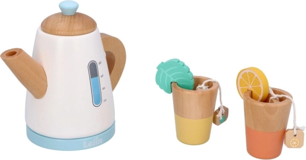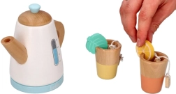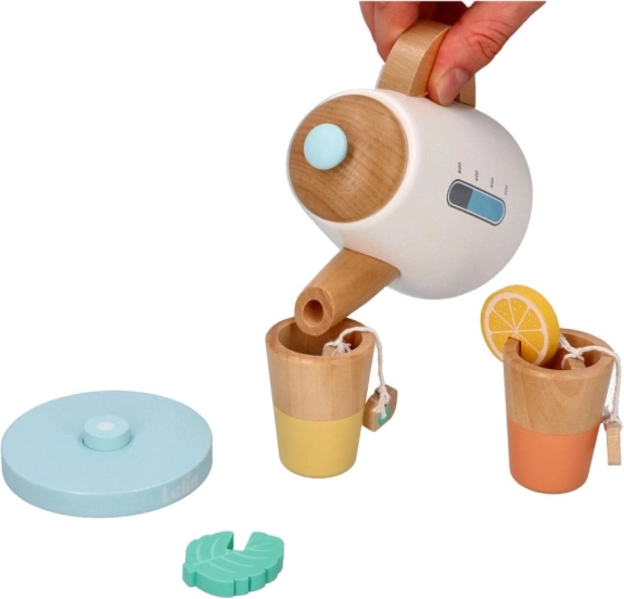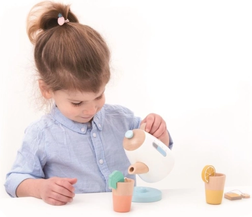 Dołącz do zabawy w herbaciane przyjęcie z drewnianym zestawem, w tym zawierającym dzbanek, filiżanki i akcesoria takie jak plasterki cytryny i torebki herbaty.