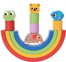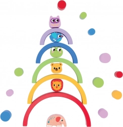 Ta wszechstronna drewniana układanka oferuje nieskończone możliwości zabawy. Dzieci mogą budować wieże, mosty i tory z kolorowych łuków, próbować balansu ze zwierzątkami i ćwiczyć koncentrację. Połączenie tęczowych półokręgów i figurek rozwija kreatywność oraz uczy logicznego myślenia i wyobraźni przestrzennej.