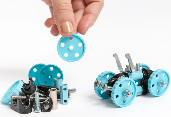 W komplecie znajduje się praktyczne narzędzie oraz zestaw kółek i łączników, więc możesz zacząć budować od razu po rozpakowaniu.
