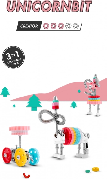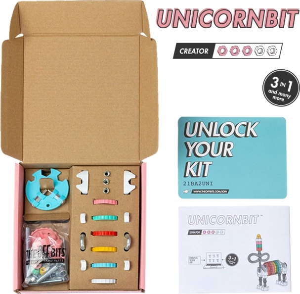 Magiczny JednorożecBit wprowadza dzieci w świat pełen fantazji i technicznych umiejętności. Z jednego zestawu zbudujesz 3 różne modele – JednorożecBit, bajkowego RobotBit lub AutoBit – a dzięki kompatybilności z codziennymi przedmiotami w domu stworzysz także własne, unikalne wynalazki.