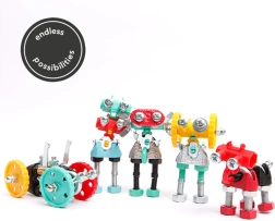 Z tym zestawem nie ma problemu stworzyć roboty, samochody lub niezwykłe wynalazki. Możesz wykorzystać wyobraźnię i różne materiały do recyklingu, takie jak tektura czy śruby.